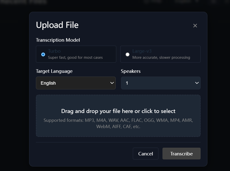 - Multi-format Compatibility:Easily supports common audio and video formats like MP3, MP4, WAV, and M4A. Users can upload files directly to start transcription without additional format conversion.